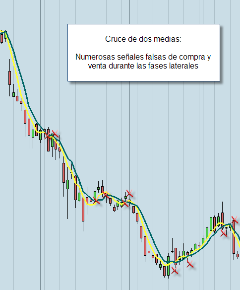 Todos conocemos el sistema de las dos medias móviles: Se ponen una media rápida y una lenta sobre el precio. Cuando la rápida cruza a la lenta y se coloca por encima de ésta, entramos comprados en el mercado y cuando es la lenta la que está por encima de la rápida, cerramos largos y abrimos cortos. De este modo, nos mantenemos siempre dentro del mercado; fases laterales incluidas.