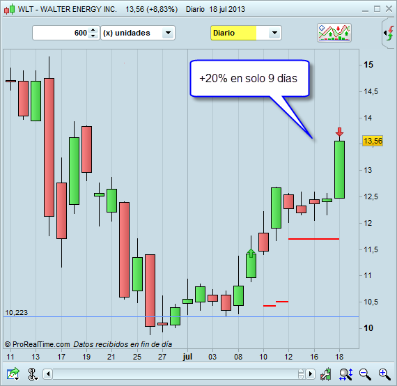 Nota importante: Si revisas mi planteamiento de esta operación, observarás que contemplo la posibilidad de que este precio llegue mucho más lejos. Si así fuera (y visto el gráfico, seguramente lo sea) yo seguiré contento. La razón es que decidí de antemano (antes de abrir la operación) que saldría en un objetivo poco ambicioso (si es que +20% se le puede llamar poco ambicioso) a cambio de salir en el objetivo con una orden limitada, y no en el stop loss de persecución (más arriba que ahora… o no). Lo crucial es que estoy respetando mi plan y todo ha
