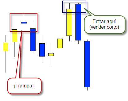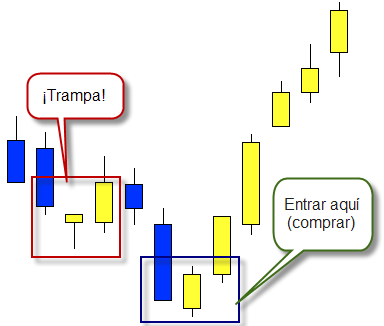 Antes de nada, vamos a ver la forma que tiene una trampa. Al fin y al cabo, simplemente se trata de una cosa que no es lo que parece ser. El precio va en un sentido y nosotros, cazadores de rebotes, esperamos al momento idóneo para entrar en sentido contrario. Sin embargo ¡es una trampa! Ahora que estamos dentro, el precio continúa con su movimiento anterior tirando por tierra nuestra idea de hacer dinero.